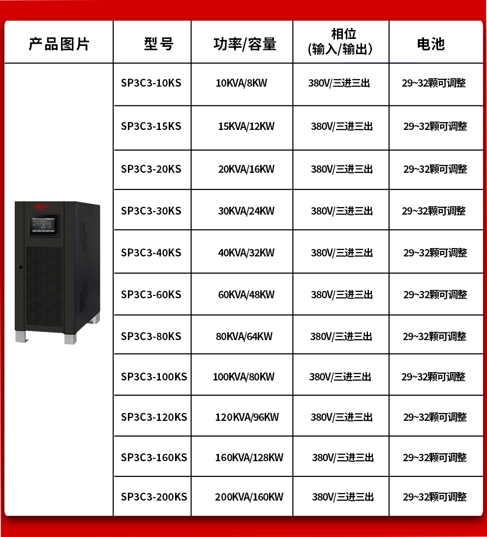 1.靈活配置,因需而變:針對電磁干擾與射頻干擾,3C3系列UPS依循國際EN50091-31E6100-4系列標準設計,有效提高 UPS使用的安全性與可靠性