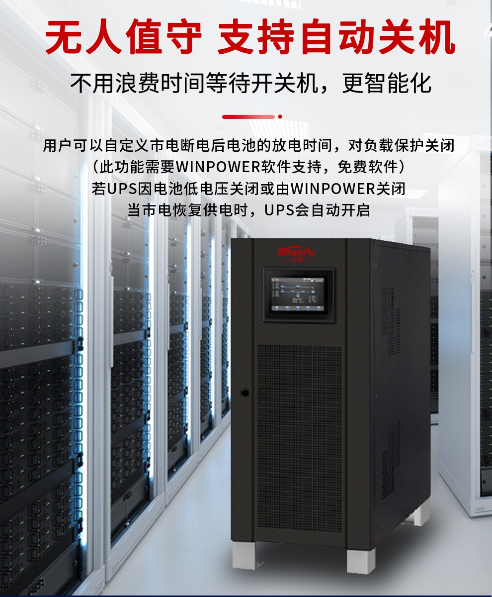 5.自動啟動功能:當市電異常進入電池模式供電直到電池狀態關機,市電恢復正常,HBG系列UPS自動啟動開機,正常供電, 無需用戶開機值守。