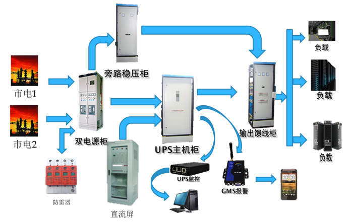 1. ATS雙電源柜(或內置式ATS):保證UPS在市電1與市電2(或發電機)之間靈活切換,減少直流屏(或蓄電池)放電次數與時間,保障設備安全運行。