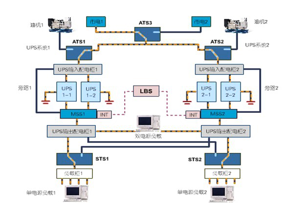 為了消除可能出現在UPS并機系統輸出端與用戶端之間的“單點瓶頸”故障隱患,有必要配置雙總線模塊化(N+X)UPS的輸出配電系統。其基本配置是由“N+1”型模塊化UPS冗余供電系統(優選“1+1”或“2+1”型并機供電方案)+輸出配電柜+負載自動切換開關(LTS)所組成的UPS輸出供電系統。對于某些要求極高的場所,還應配置由負載同步控制器(LBS)+兩套“N+1”型模塊化(N+X)UPS冗余供電系統所組成的具有極高“容錯”功能的供電系統。鑒于目前在IDC機房中所用的服務器和磁盤陣列機等產品中有(30~50)%為采用“雙電源輸入供電”體制的產品,對于這些設備,可以直接將分別來自兩套“N+1”型并機系統的電源連接到這種“雙電源輸入設備”的兩個輸入端上。對于采用“單電源輸入供電”方式的關鍵負載,則是將分別來自兩套“N+1”型并機系統的電源首先連接到“負載自動切換開關”(常見的是STS型的靜態開關和SS型的快速切換開關)的兩個輸入端上,然后再將用戶的關鍵設備連接到“負載自動切換開關”的輸出端上。